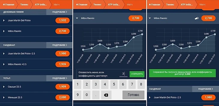 Для примера берём матч: Дель Потро – Раонич.Допустим, мы считаем кф=3 на Раонича — валуем.Мы вводим под графиком значение на наш взгляд валуйного коэффициента. Если коэффициент на Раонича станет равным 3 (или больше), то нам придёт оповещение. Это довольно удобно потому, что как только данная котировка достигнет 3, вы сможете оперативно сделать ставку.