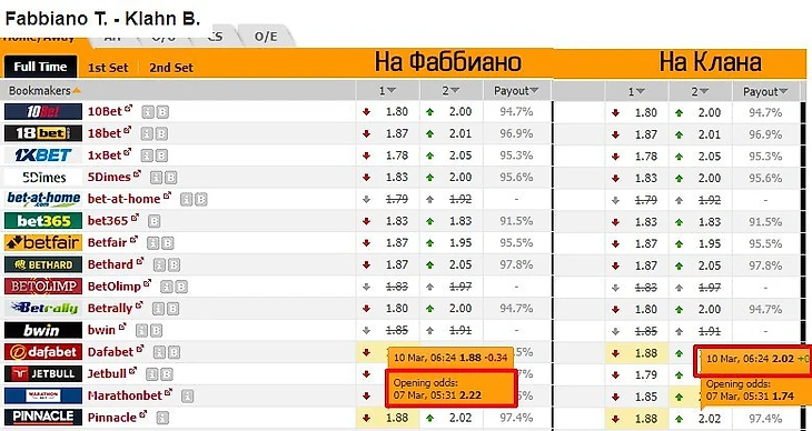 В таких случаях нельзя сказать, что валуев нет, если, как в матче с Куэрри — Раонич или Клан — Фаббиано, нам предлагают коэффициенты больше двойки в обе стороны. Понятно, не одновременно. И таких событий много, коэффициенты двигаются, и в некоторый период времени, либо в начале, либо в середине, либо в конце очень часто валуи есть. Но эти валуи относительно быстро исчезают (от пары минут до пары часов).