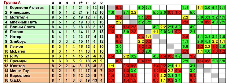 Предварительный этап командного чемпионата перевалил за середину, 8 туров позади – 7 впереди. Как показал осенний цикл, за половину первого этапа турнирные таблицы могут кардинально измениться, поэтому лидерам ещё рано почивать на лаврах, а нынешним аутсайдерам – впадать в уныние. Тем более, сейчас, когда можно спуртануть, зацепиться за топ-8 и получить шанс побороться за чемпионство. Да, я напоминаю, что Клаусура проходит по экспериментальной схеме, при которой верхние восьмёрки групп А и В сформируют большую группу 1-16 на финальном этапе и каждая команда перенесёт на вторую стадию очки, набранные с соперниками по «полушарию» в ходе первого этапа. Сейчас я покажу, как бы прошло распределение, финишируй команды на текущих позициях. Перед непосредственно сводной таблицей представляю традиционные таблицы групп, но с добавлением шахматок.