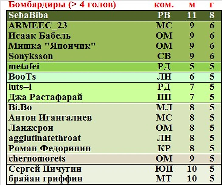 Больше 4 голов смогли забить всего 17 человек, поэтому я привожу и список 28 игроков, выигравших по 4 микродуэли.