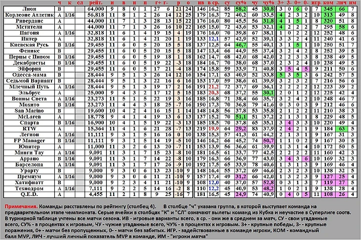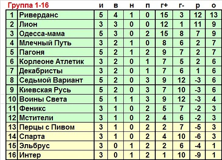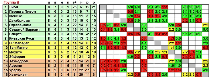 Одесса-мама, Седьмой Вариант и Киевская Русь, пребывающие в верхней половине таблицы, уже сыграли с лидирующим квартетом, впрочем, отнесение к лидерам Феникса и Декабристов отчасти условное, той же Руси с 8-го места всего 3 очка до 3-го. И «русичи» как раз в меру успешно провели громкие лички, +2=0-2, это лучше, чем у «седьмых». Одесситов с их строгостью по тактике прогнозов бросает из крайности в крайность, за 8 туров 7 результатов с крупным счётом, 4 в плюс, 3 в минус. Остаётся поражаться, как Хатифнатт умудрился сыграть с ними вничью 2:2. Хатти, кстати, 3 матча завершил вничью и именно с данным счётом, из всех остальных команд больше 2 ничьих только у Эльбруса (3) и Мохито (4).
