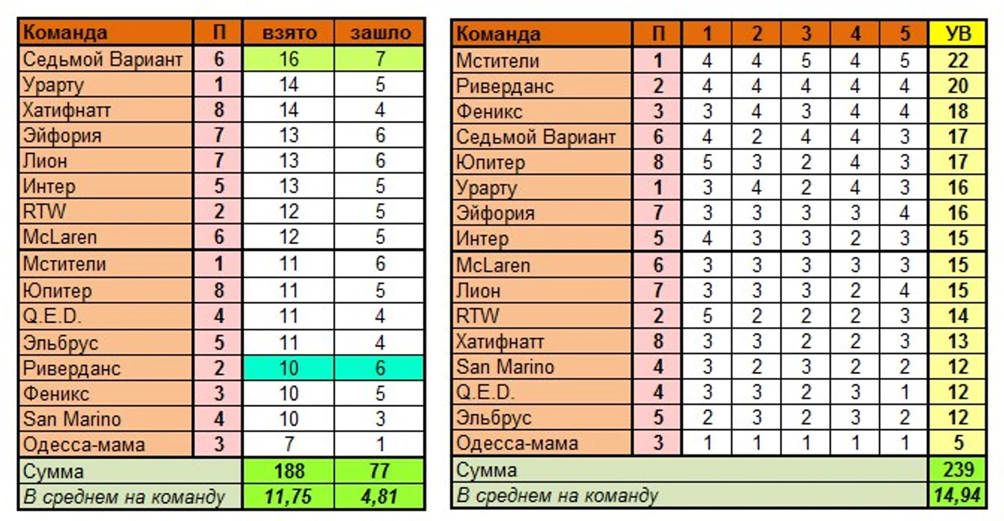 Лучшая команда тура по сумме УВ в целом:  Мстители (22 варианта)