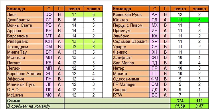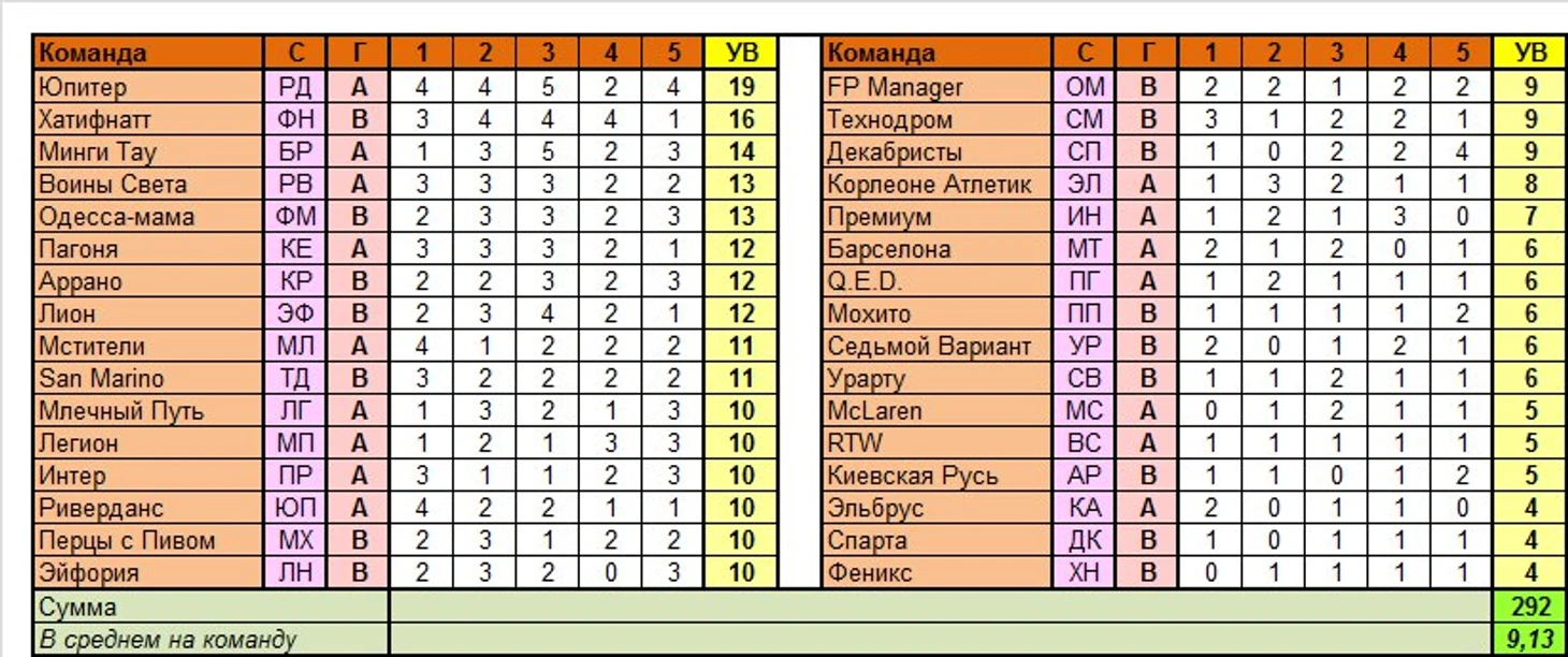 В Технодроме совместными усилиями подбили 6 позиций (максимум по туру), но 5 из них носили единичный характер. Похожая ситуация в Ривердансе. А Юпитер из своих 6 успешных выставил 4 минимум на 3 линиях, 6-11-14-34. Да, "юпи" проявили чуйку и по карточкам, "34" взяли всем составом. Аналогично сделали в Одессе-маме, но жёсткий заряд на 1-4-7 и "15" свёл попадание на нет. На 2 линиях "34" использовали Барселона, Воины Света и Аррано. Барса, как и "одесситы", пострадала от загруза на Реал и "верх" (оппоненты из Минги Тау были более проницательны), а Воины и Аррано добились побед. Аррано стало единственной командой, допускавшей победу Атлетико в МДП, 2-6-8 попробовали на паре линий, в том числе и лично тренер, АРИ. До такого итога дело не дошло, но все 6, 22, 34 оказались открытыми в борьбе с Киевской Русью, в результате уверенная виктория 5:0.