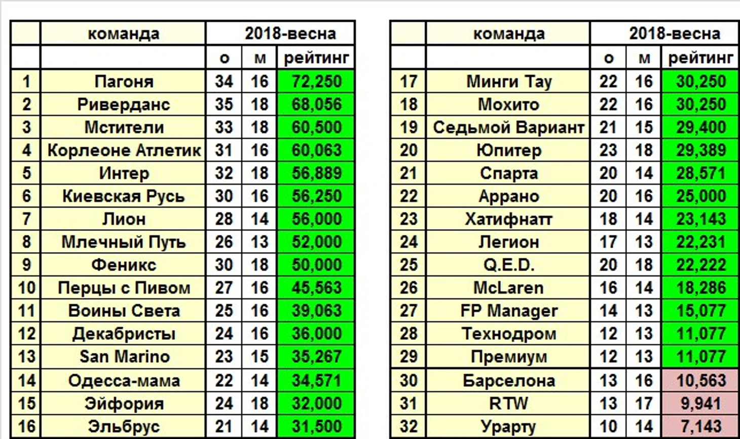 Демонстрирую здесь и обновлённый с учётом прошедших матчей 1/4 Кубка рейтинг сезона: