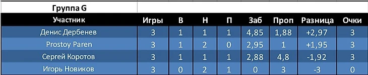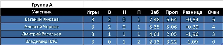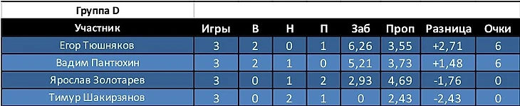 Алексей получил 0 очков, хотя его ставка сыграла, тк коэф соперника был выше. Разница забитых и пропущенных -6,27.