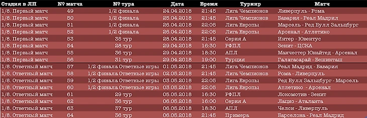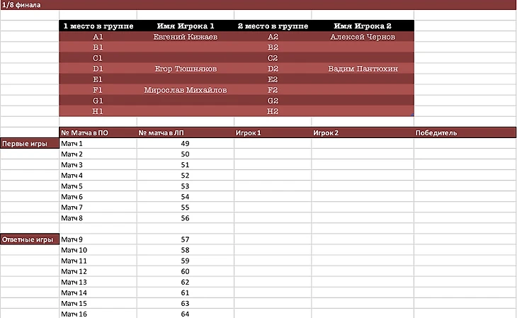 Жеребьевка будет проходит на основании таблицы ниже (заполнена на конец дня 21.04.2018). Приведу пример. Первым из корзины со вторыми игроками выпадает Вадим Пантюхин. Он отправляется в Матч 1 и автоматически будет играть на выезде Матч 10. Далее из первой корзины вытягивается следующий игрок. Например, это Евгений Кижаев. Итого мы получаем пару Вадим Пантюхин - Евгений Кижаев и им достается пара игр 1 и 10. Это матчи Ливерпуля и Ромы в 1/2 финала Лиги Чемпионов. По такому принципу определяются все пары.