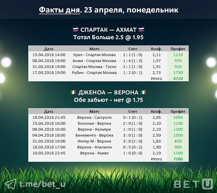 Мы возобновляем рубрику «Факты дня»! Сегодня разберем факты про московский «Спартак» и «Верону», которые проведут очередные свои матчи в чемпионатах России и Италии. С обоих фактов – чистая прибыль 12300 рублей!