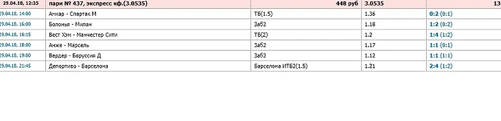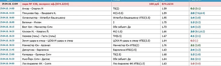 Несмотря на такое крупное число, все матчи в нем были продуманы, и исходы были самые разнообразные. Как фора минус и фора плюс в теннисе, так и победные исходы в футболе, ТМ и ТБ и тд.