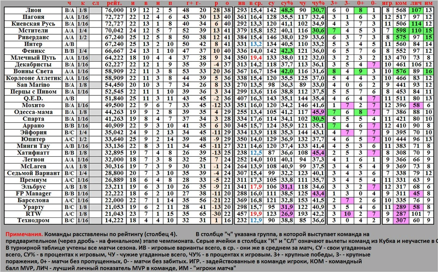 По итогам полуфинальных матчей изменился сезонный рейтинг их участников, представляю обновлённое положение, но не в отдельной таблице, а в сводной, где накапливаются и иные статистические показатели по ходу сезона: