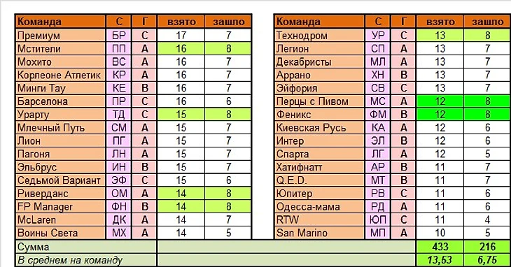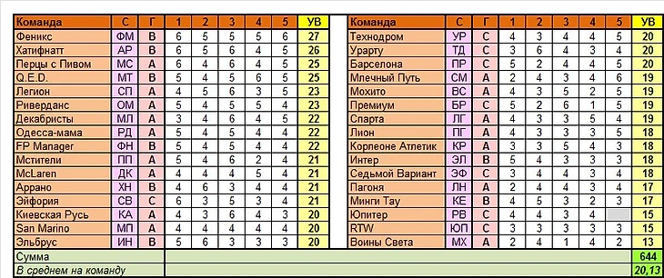 Лучшая команда тура по сумме УВ в целом: Феникс (27 вариантов)