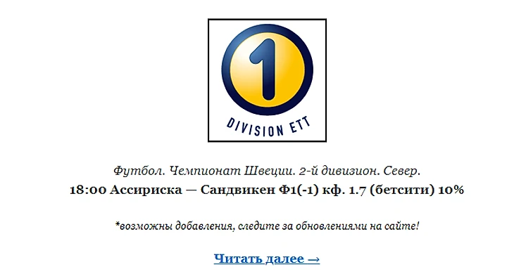 18:00 Ассириска — Сандвикен Ф1(-1) кф. 1.7 (бетсити) 10%
