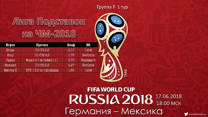 Ниже варианты ставок наших участников матч чемпионата мира по футболу - 2018: Германия - Мексика.