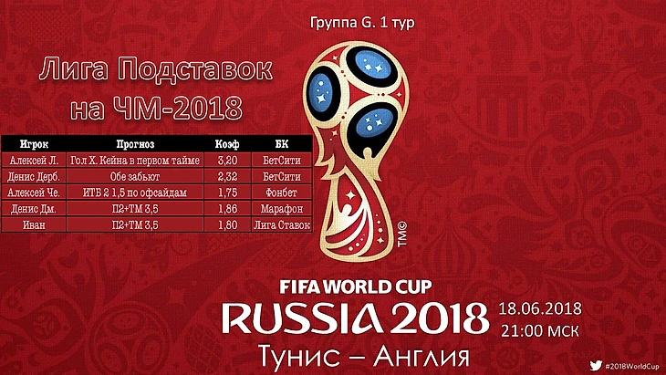 Ниже варианты ставок наших участников матч чемпионата мира по футболу - 2018: Тунис - Англия.