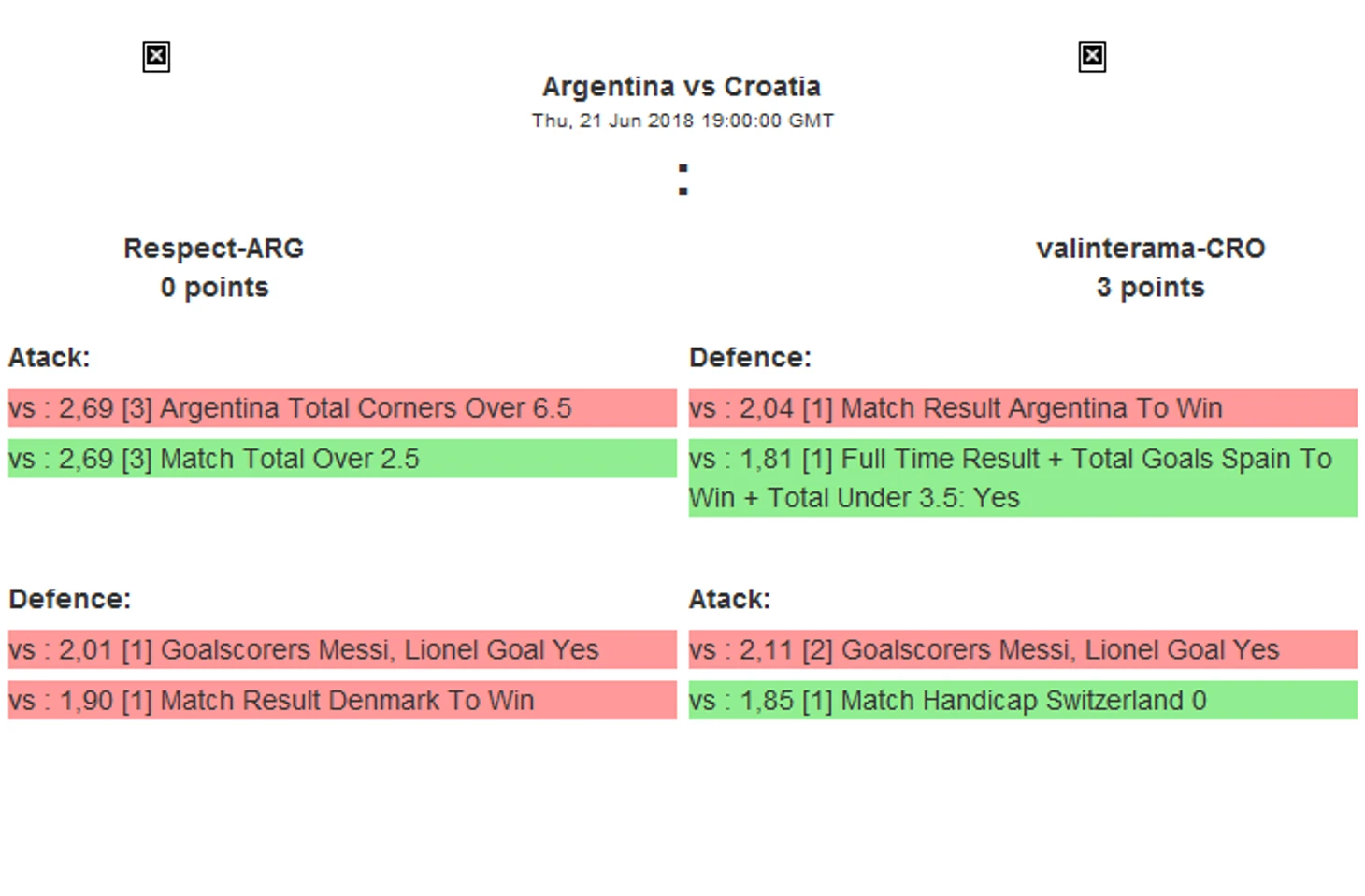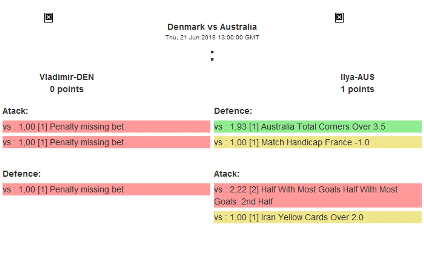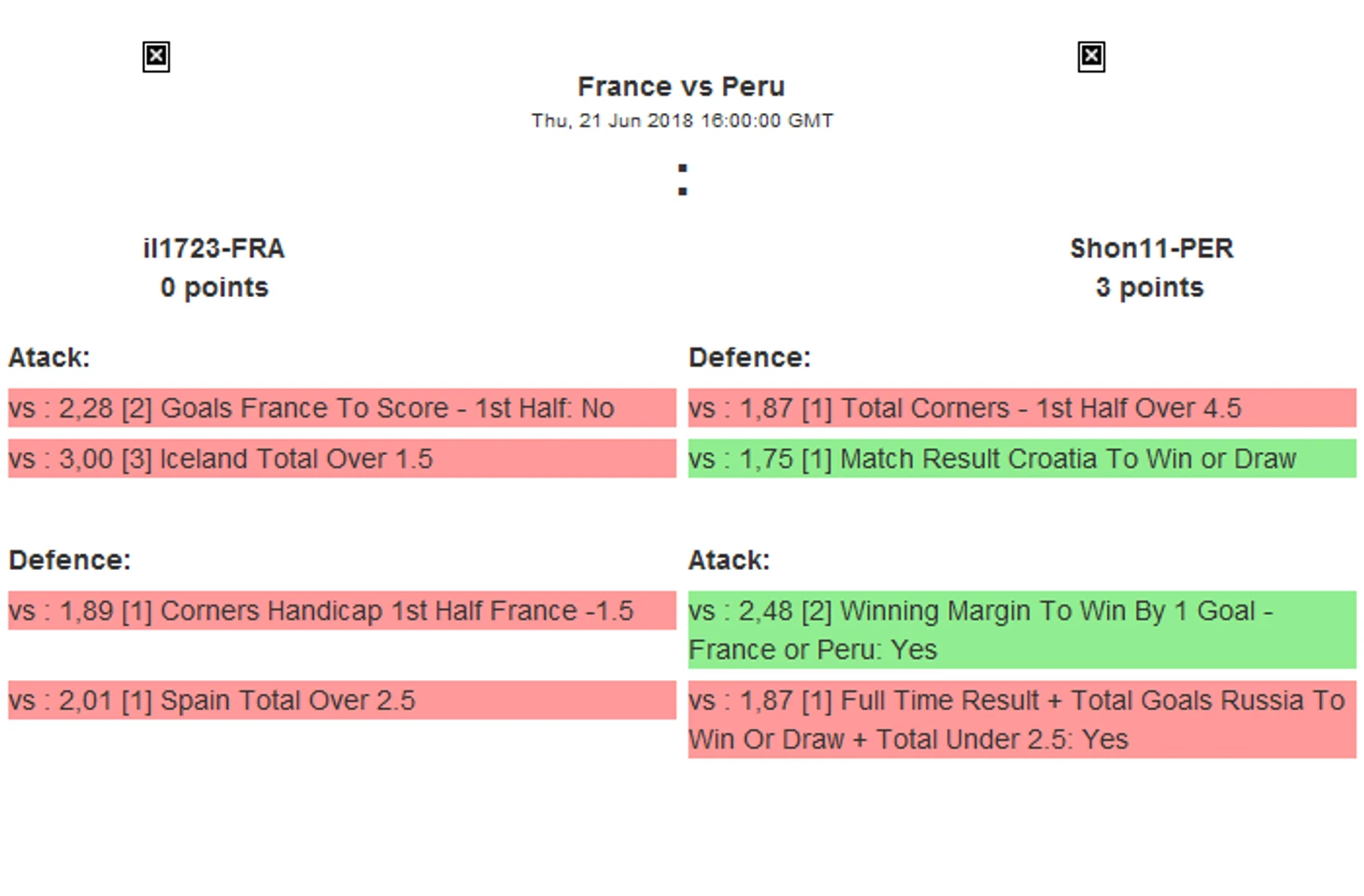 А в моем матче.. мне нравится Перу, учитывая каким говном Франция была в первом матче, не думаю что им будет легко забить...