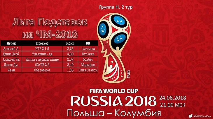 Ниже варианты ставок наших участников матч чемпионата мира по футболу - 2018: Польша - Колумбия.