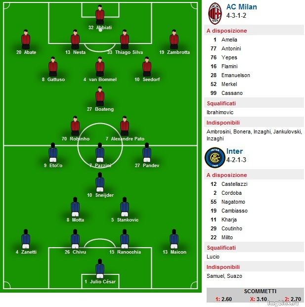 Что тут сказать! Дерби мать его! Тут возможно все. Шансы Интера предпочтительнее, больше вариантов в схеме, может сыграть 4-3-1-2, если не пойдет второй тайм 4-2-3-1, Здоров Милито, есть кем усилить в случае чего. Опасение только за центр защиты, но отсутствие Лусио может и не скажется,т.к. нет Ибры и бороться на втором этаже по сути не с кем, и Пара Киву - Ранокью может оказаться как раз к стати, Пато - Роби юркие парни.