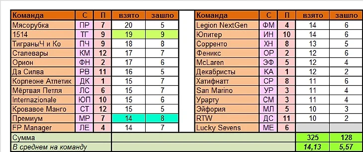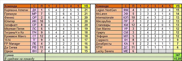 Лучшие команды тура по сумме УВ в целом: Корлеоне Атлетик, Премиум (по 21 варианту)