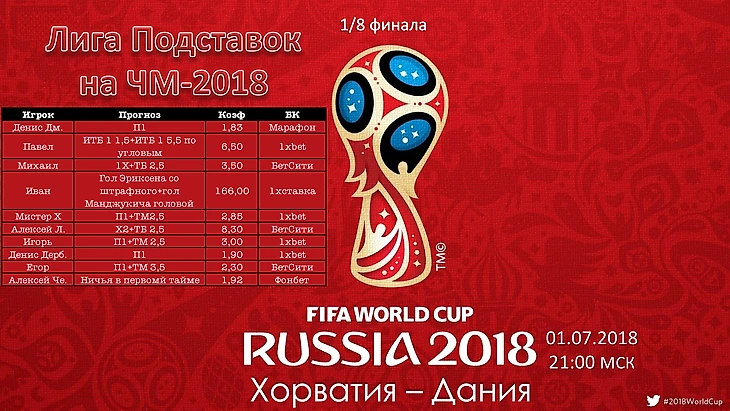 Ниже варианты ставок наших участников на матч 1/8 финала чемпионата мира по футболу - 2018: Хорватия - Дания.