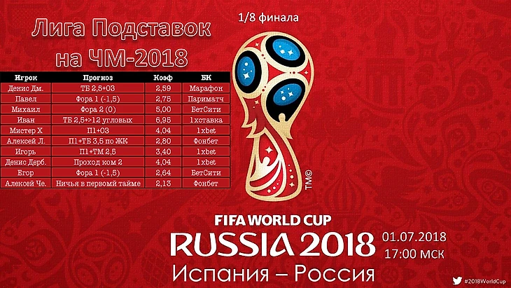 Ниже варианты ставок наших участников на матч 1/8 финала чемпионата мира по футболу - 2018: Испания - Россия.