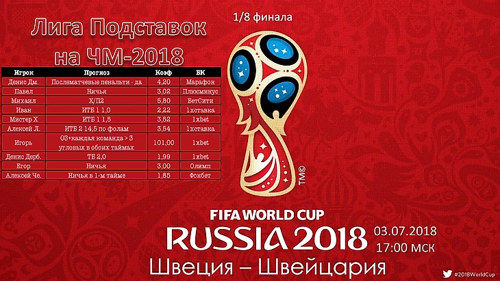 Ниже варианты ставок наших участников на матч 1/8 финала чемпионата мира по футболу - 2018: Швеция - Швейцария.