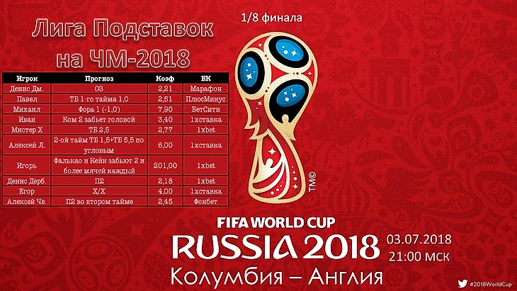 Ниже варианты ставок наших участников на матч 1/8 финала чемпионата мира по футболу - 2018: Колумбия - Англия.