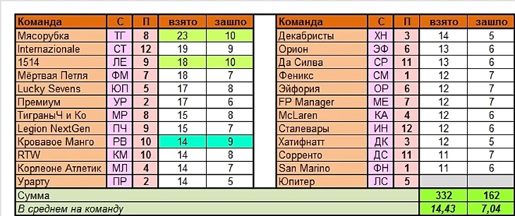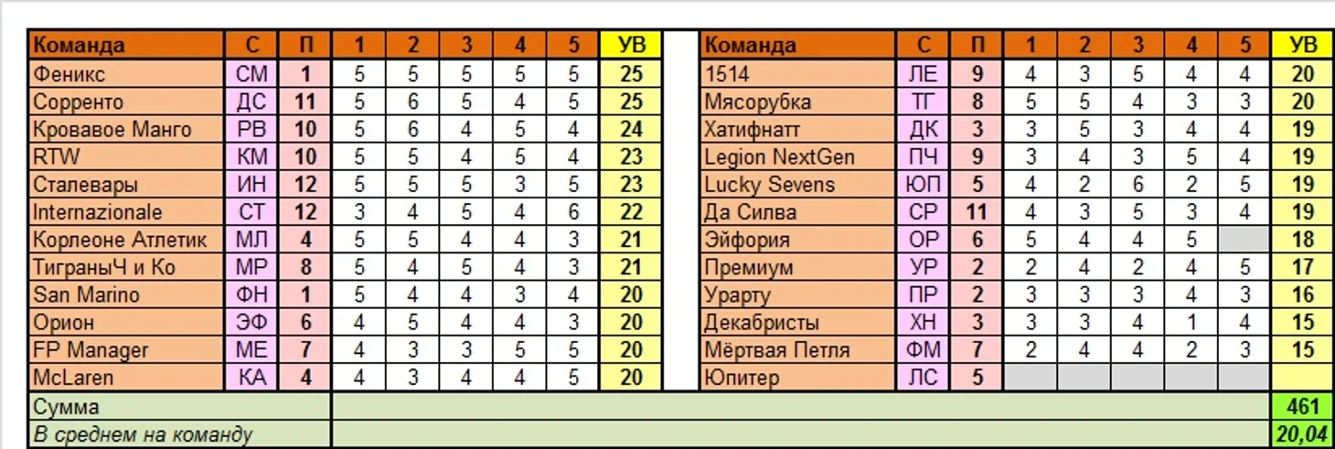 Лучшие команды тура по сумме УВ в целом: Феникс, Сорренто (по 25 вариантов)