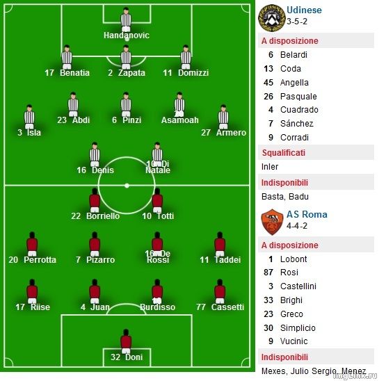 - молодая команда, очень техничная. Борриелло тренируется с огромным профессионализмом, это я даю ему мало возможностей, Марко очень хочет помочь команде. Он грустит, когда не играет, Борриелло сказал, что когда я пришел, он был рад, что я был нападающим и смогу понять его лучше, а я же наоборот стал ставить в атаку Перротту. Вучинич тренируется хорошо, он восстановился. У Рози есть шанс против "Удинезе", так как эта команда много бегает. Мексеса нам будет не хватать, мы видели, как он в воскресенье вышел на поле с такой травмой, я благодарен ему за любовь к этой футболке. Теперь оборона нуждается в большей поддержке, потому что игроки "Удинезе" будут с большой легкостью пользоваться разрывом между нашими линиями. Команда может играть с тремя нападающими, если все работают хорошо. Мое будущее? Я бы мог стать помощников Гвардиолы (смеется). Говорят столько всего, и иногда есть противоречие - я должен вывести команду в Лигу Чемпионов и отдать ее после этого кому-то еще? Останусь ли я тренером? Это трудный выбор, надо все взвесить. С Ди Натале мы большие друзья, я был старше, когда мы играли в "Эмполи", у меня к нему особенная симпатия, на поле он феноменален. Если бы в юности он был бы умнее, он смог бы сделать намного больше. Дони? Я поставил на него, потому что должен был сделать выбор, а еще я сразу сказал, что Жулио Сержио - качественный вратарь. Если Дони продолжает играть, то только потому, что я его очень высоко ценю. Санчес - экстраординарный игрок, он может держать в напряжении противника, даже будучи без мяча. Будущее Менеза? Перед таким важнейшим матчем будущее отдельного игрока - последнее, что меня волнует. Посмотрим.