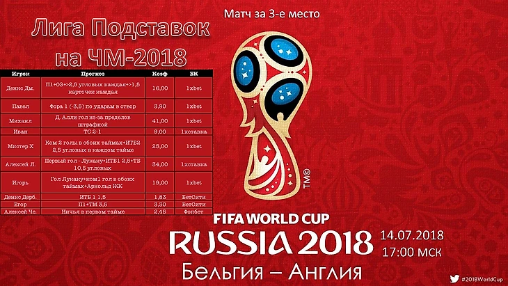 Ниже варианты ставок наших участников на матч за 3-е место чемпионата мира по футболу - 2018: Бельгия - Англия.