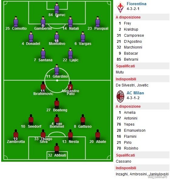 FIORENTINA: Boruc, Comotto, Gamberini, Natali, Pasqual, Donadel, Montolivo, Vargas, Santana, Ljajic, Gilardino.