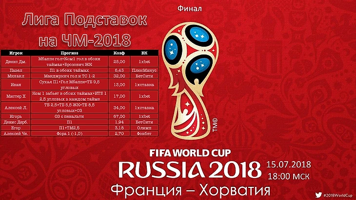 Ниже варианты ставок наших участников на финал чемпионата мира по футболу - 2018: Франция - Хорватия.
