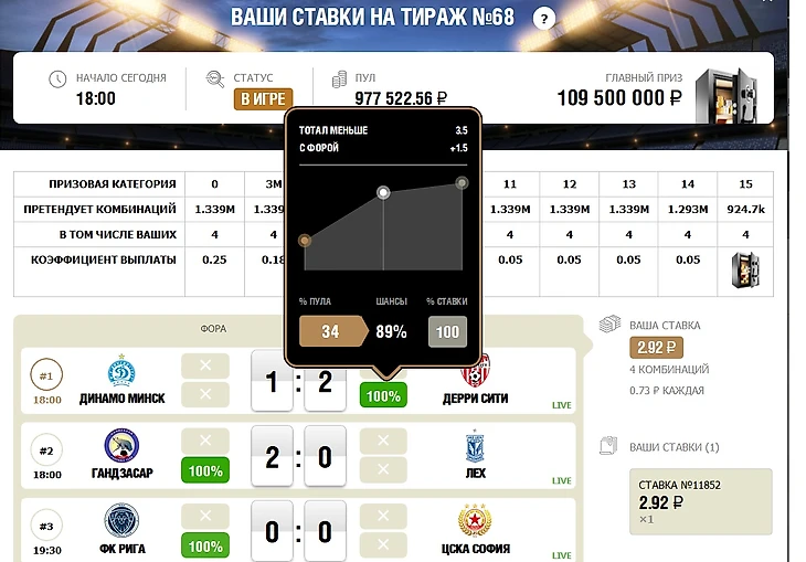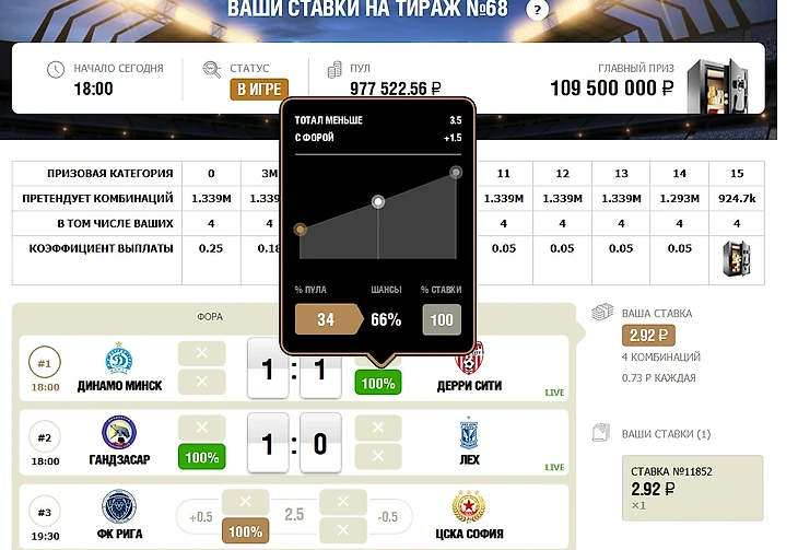 Как видно, после первого тайма шансы на выигрыш этой комбинации возросли почти вдвое - до 66 %. Счет 1-1. Изначально было 37%. Вырос и пул, как видим, - почти миллион рублей в целом на тираж.