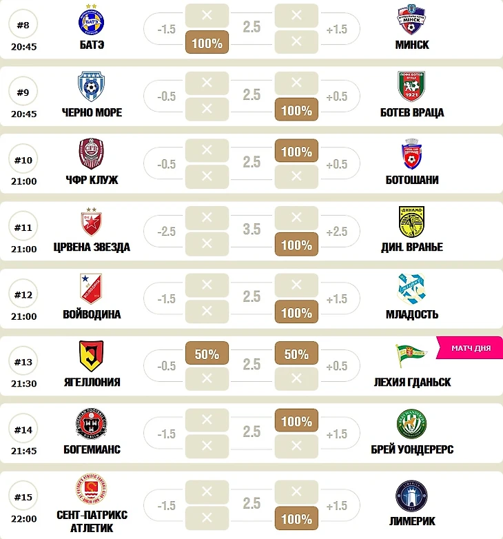 Надо признать, что в ТОТО-15 удобный функционал.Пятница 20 июля предлагает кучу интересных для ставок матчей. Причем именно для ставок на форы. А форы, как уже отмечалось, в этом тотализаторе ключевая категория.