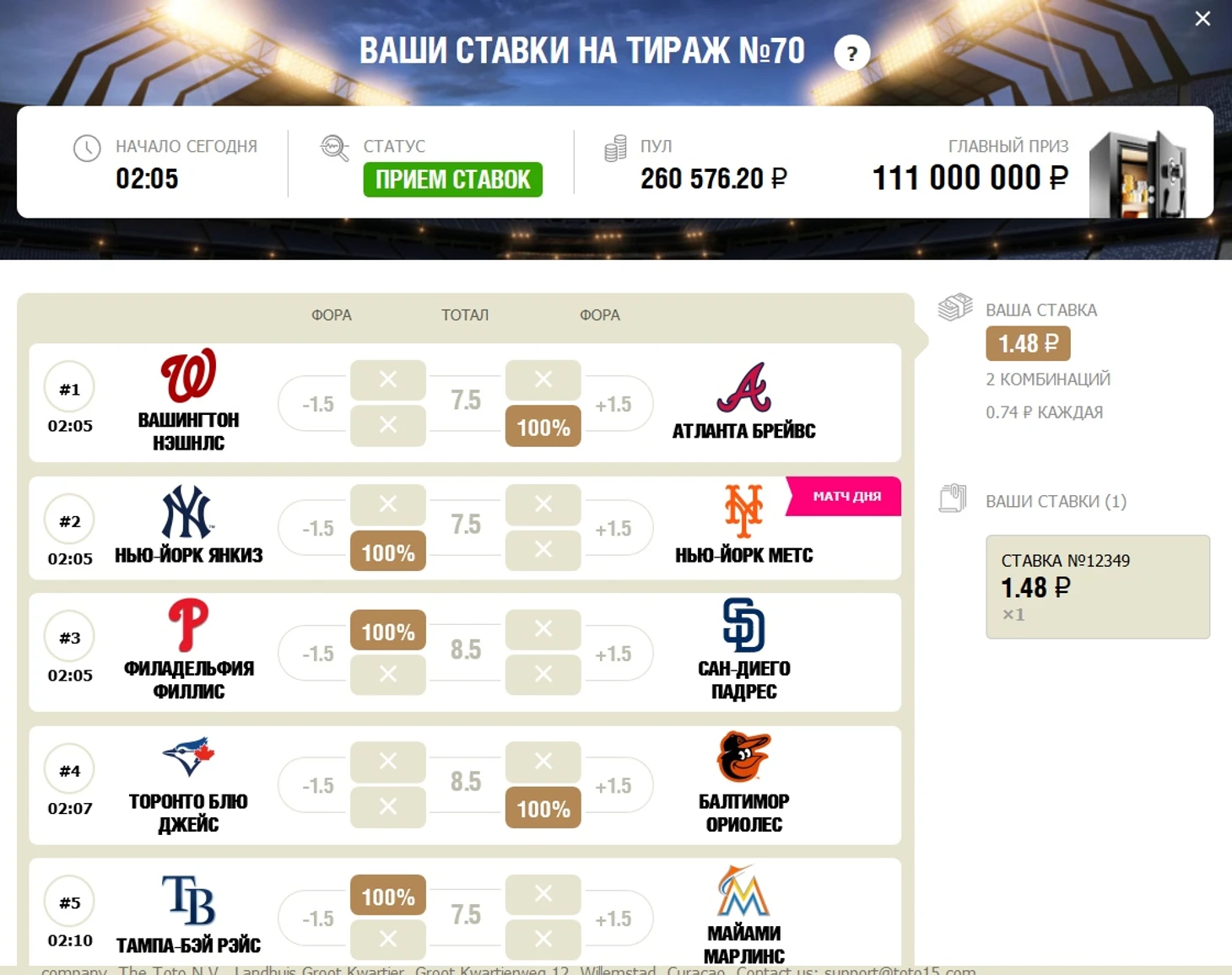 Очередной тираж нового тотализатора - ночной бейсбол. Принцип тотошки таков, что можно теперь ставить на бейсбол, поскольку, напомню, в ТОТО-15 играют форы, а не результаты!