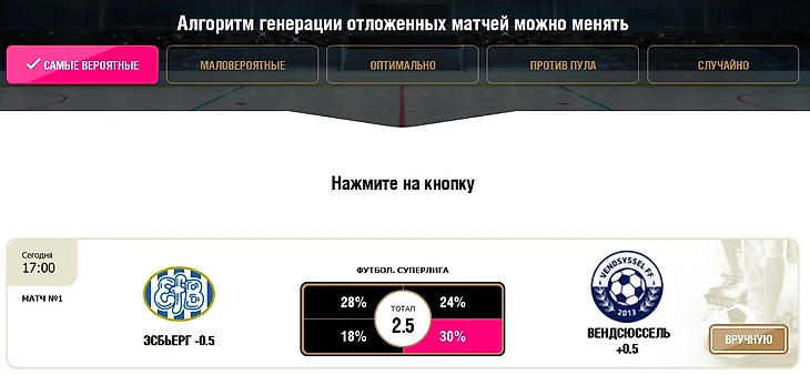 Для начала отметим удобную опцию в тотализаторе: можно уделить внимание всего лишь трём предложенным тотошкой матчам, а остальные 12 исходов доверить "машине" - алгоритм сам поставит комбинации по заданным параметрам: