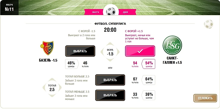 2. В Швейцарии беру плюсовую фору на Санкт-Галлен. То есть неплохие +1,5 на гостей: шансы 54%.