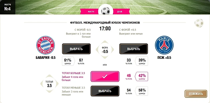 1. Международный кубок чемпионов. Бавария против ПСЖ. Не мудрствуя лукаво, выбираю тотал больше 3,5. Шансы 42%.