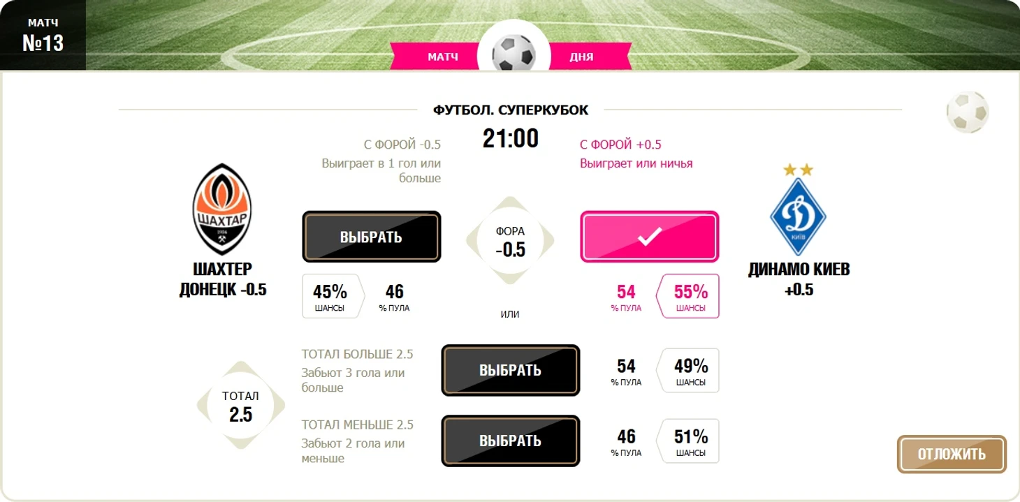 3. Суперкубок Украины Шахтер - Динамо Киев. Ставлю, что Динамо не проиграет, а итоговый счет не важен - закрываю две правые ячейки. Шансы 55%.
