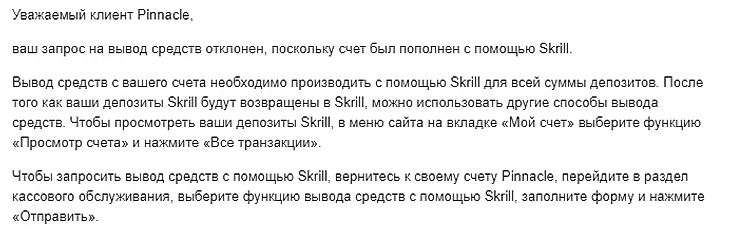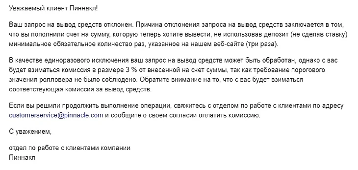 Но неожиданно жена говорит, что холодильник совсем не морозит и нужно срочно купить новый. А где взять 500$? Видимо, снять обратно со счёта Pinnacle. Ставки подождут, правда ведь? А вот и нет. Ставки ждать не будут! У букмекера Pinnacle есть правило, что вы не можете сделать вывод средств, пока не проставите сумму пополнения 3 раза. Т.е. если вы докинули 500$ на ваш счёт, вы не можете снять деньги не проставив суммарно 1500$. А только потом, если что-то останется, поговорим о холодильнике, дорогая. Или пожертвуем 45$ (3%) букмекеру. Вам придёт такое письмо: