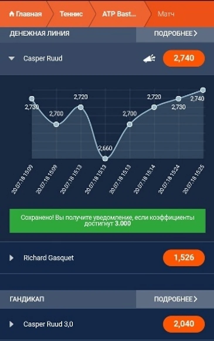 Но есть в приложении один фантастический плюс, который я нигде не видел: возможность отслеживать движение коэффициентов и оповещения при достижении нужного значения. Очень круто и полезно!