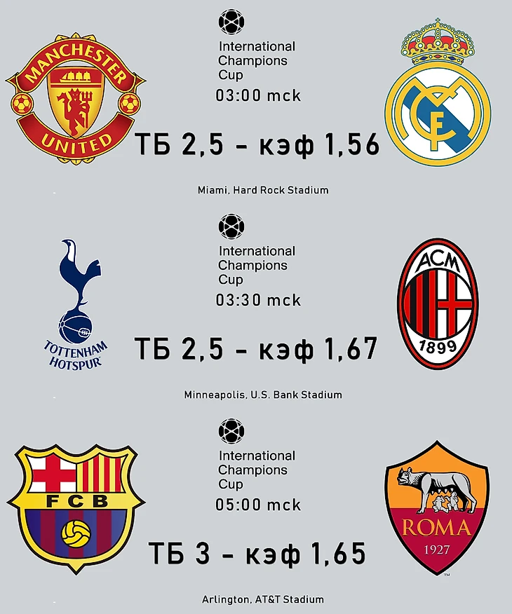 На другой стороне земного шара столкнутся лицом к лицу одни из лучших европейских команд! К слову, одна из мегапопулярнейших банд, мадридский "Реал" сегодня примется покорять эти вершины, в то время, как его оппненты уже либо заканчивают своё участие на турнире, либо близки к этому. Матча сегодня три. И играть я буду все три битвы. Думаю, что "сливочные" и "манкунианцы" накатят друг другу по паре голов. Первые - потому что могут себе это позволить, несмотря на потерю ведущего бомбардира. Вторым - это просто необходимо, а то Моуриньо уже какой день подряд ноет, что боится начала сезона, что команда не готова, и тому подобное. Подопечным пора доказывать, что тренер говорит полную чепуху. "Тоттенхэм" в позапрошлой игре против ещё одного итальянского гранда, а затем, против "Барселоны" уже показал, на что способна их атакующая мощь. Ну и, собственно, всё та-же "Барселона" должна взять, пусть и товарищеский, но всё-же реванш у римлян. И что-то мне подсказывает, что голов тут будет не мало. Всем удачи!