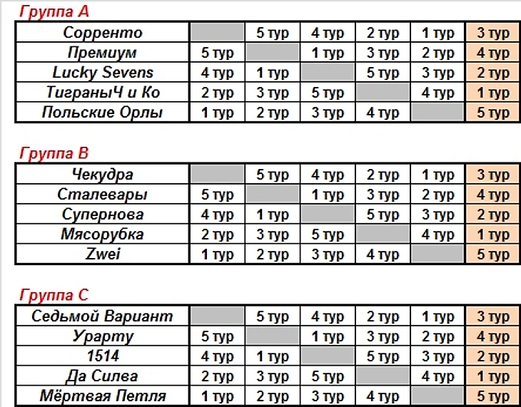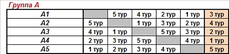 Далее представляю шаблон шахматки группы, она не совсем традиционная ввиду нечётного числа команд.