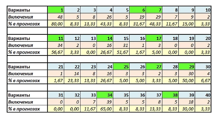 "Седьмые" сделали чёткий упор на низовой характер матча по голам с уклоном на победу Бенфики. И если в успех хозяев верило и большинство других команд, то в сценарии с малым числом мячей вложились разве что Сталевары и Польские Орлы, и то, оставили по одной линии с "15". Седьмой Вариант же зарядил на "14" всем составом, немного развёл исходные связки, 1-4-9 и 1-6-7, с преимуществом в пользу "6". Этот вариант, кстати, во многих парах сыграл важную роль, все команды, разместившие его более, чем на одной линии, свои матчи выиграли: и Чекудра, и Сталевары (по 3 включения), и Седьмой Вариант (4), и Польские Орлы (5). Как ни странно, "4" на первый тайм оказался более популярным выбором, чем "6". А была ещё команда, загрузившая на "5", Zwei поверили, что Фенербахче одолеет Бенфику, и решили накрыть радикально, через 2-5-8. Затея эта с треском провалилась, ещё и закос на "верх" не сработал. Только в карточки попали с "34".