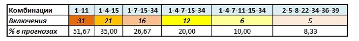 Вариант "34" стал вторым по популярности среди всех 40 пунктов, уступил только "1" и , взяли его 39 игроков из 60. Всем составом, помимо "цвайеров", его задействовали Премиум и Чекудра. У ЧК при этом он оказался открытым на всех 5 строчках, Мясорубка миксовала "33" и "35", и по сюжету в целом ожидала нестандартных сценариев, используя, например, связки 3-8, и с большим числом голов. Греймон со своими подопечными подловили их на этом, поступили более прагматично, совместив хардкорные комбинации с классическими, в итоге три игрока угадали по 6 вариантов, а два - всего по 2.  А Премиуму "34" не помог, на 3 линиях он был перекрыт, и много подопечные Сергея Сидоренко пропустили от Польских Орлов на 6-14-29, сами заряжали 4-15. Правда, и "7" использовали по максимуму, наряду с Сорренто и Урарту. Урарту выступили более сбалансировано, чем соперник, Мертвая петля, но по победам на линиях ничья. Спасли Vladlenman'а игроки с позиций 4-5, угадавшие 7 и 5 вариантов соответственно.