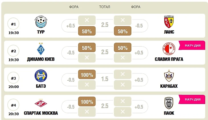 Все в принципе просто. Например, моя ставка: Победа Спартак и Батэ (обе с тоталом больше - 2,5 и 1,5 соответственно); киевское Динамо и Славия в матче назабивают голов больше 2,5; во Франции Тур и Ланс сыграют на тотал меньше 2,5. Ну и так далее.