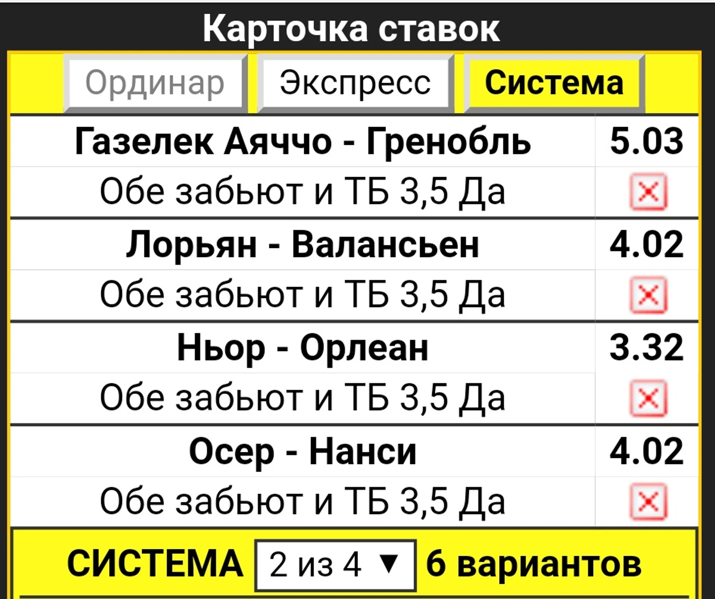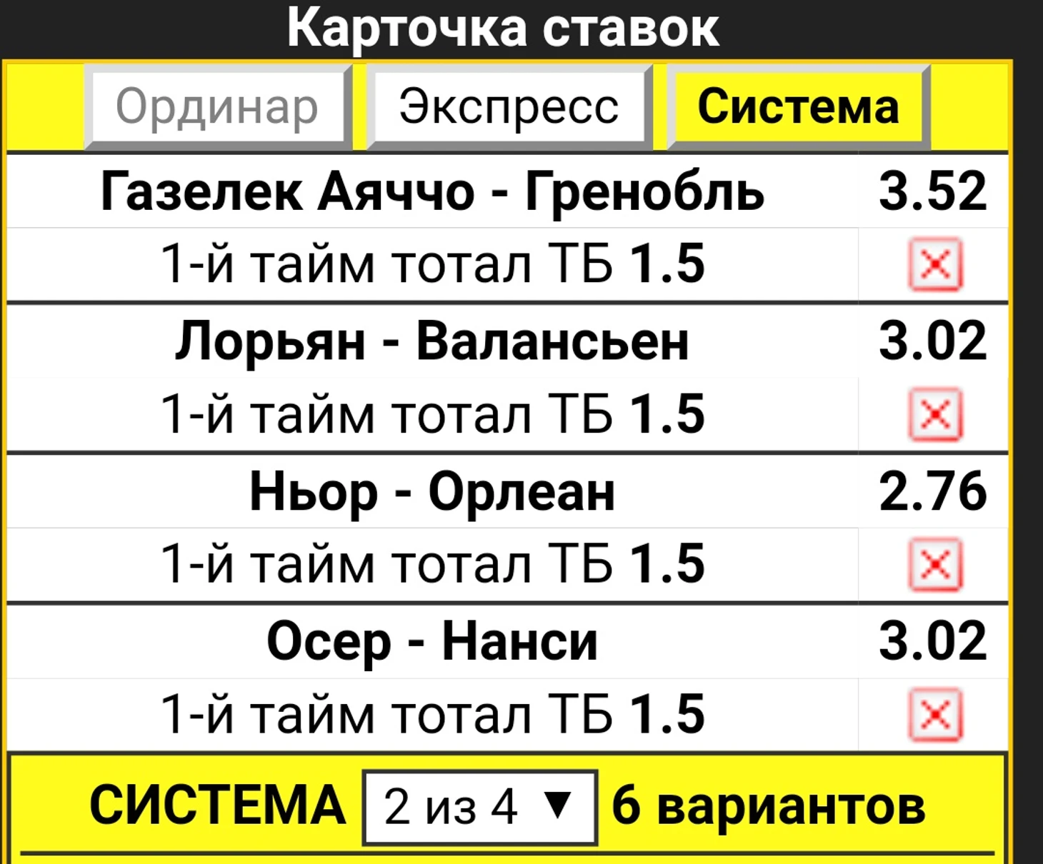Вы посмотрите какие кэфы на два гола в складчину за первый тайм!!! Заверните нам скорее!!!))) Берем!!! Здесь два матча с хозяевами-фаворитами ( это Ньор и Осер) , а другие два матча равных команд где больше вероятен верх, чем низ.