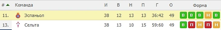 Как видим команды были соседями по турнирной таблице и заняли 11 и 13 место. Эспаньол был выше в таблице только по дополнительным показателям.