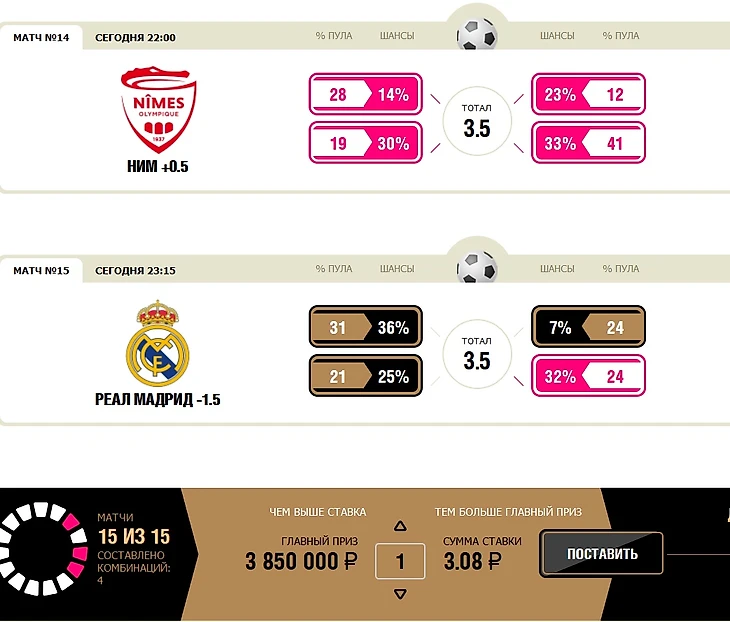 Далее нужно выбрать исходы на представленных к розыгрышу матчей. Если вы новичок и не очень разбираетесь в командах, то можете воспользоваться опцией "помощник" или "случайная ставка" - здесь контора сама поставит на все самые популярные матчи, которые проходят сегодня.