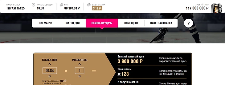 Минимальная ставка - всего 78 копейки! (При минимальной ставке джекпот составит 3,9 млн рублей). Для получении 117 млн ставка должна быть чуть более 20 рублей.