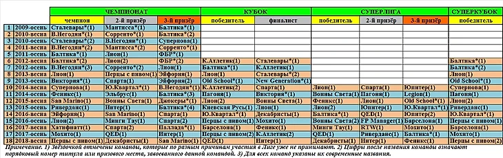 Публикую и таблицу медалистов всех существующих официальных турниров за все сезоны и благодарю Евгения Петровича "Ямато" за её формирование.
