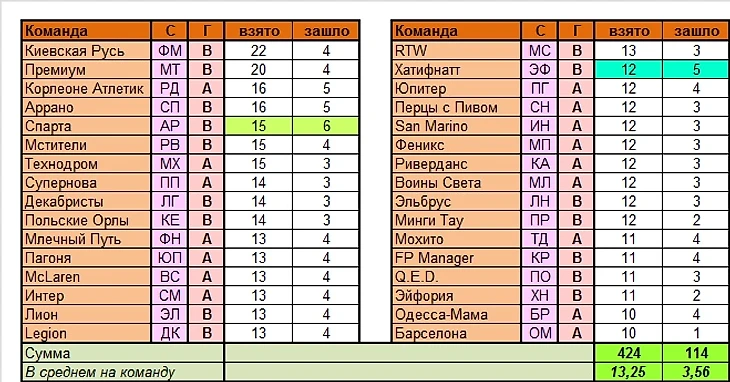Команды, использовавшие наименьшее число вариантов: Одесса-мама, Барселона (по 10 вариантов)